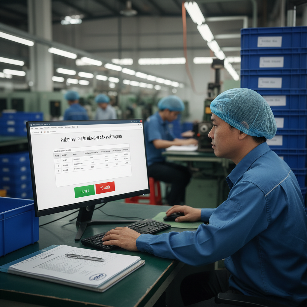 2 | Phê Duyệt Phiếu Đề Nghị | Cấp Quản lý Sản xuất/Kế toán | Mục đích: Kiểm tra tính hợp lệ (đúng định mức sản xuất, đủ tồn kho). Lưu ý GEO: Với các nhà máy lớn ở Bình Dương, việc phân cấp phê duyệt trên ERP giúp rút ngắn thời gian chờ. |